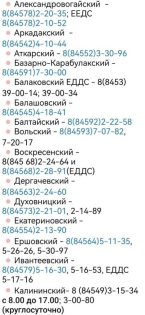 Энгельс - 8(8453)56-82-26; 56-71-29(ЕДДС) Саратов ЕДДС: 659-659Администрация Кировского района: 26-27-98 с 08.30 до 17.30 в рабочие дни. Администрация Заводского района: 96-40-50; (96-07-70) с 09.00 до 18.00 в рабочие дни.Администрация...