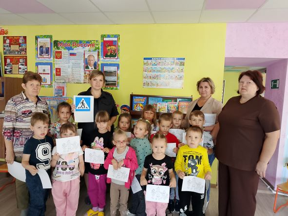 В конце мероприятия инспектор раздала взрослым памятки по БДД , а детям раскраски "Дорожные ловушки".