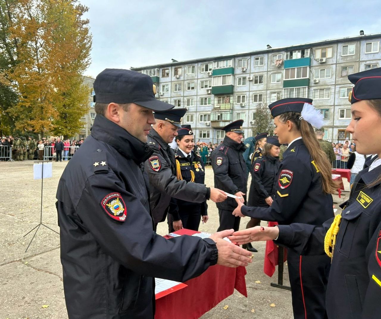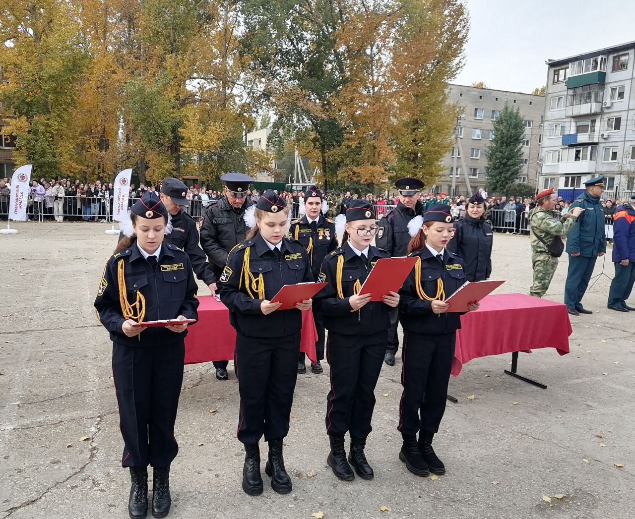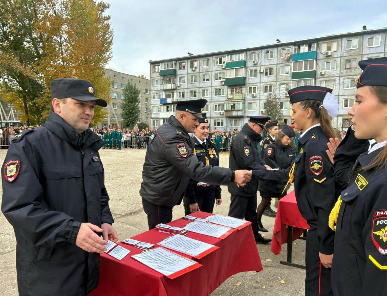 Важным моментом церемонии стало вручение кадетских удостоверений. Новобранцы получили их из рук своих наставников, в том числе и от сотрудников балаковской полиции, которые проводят для кадетов занятия и помогают освоить азы профессии сотрудника правоохранительных органов.