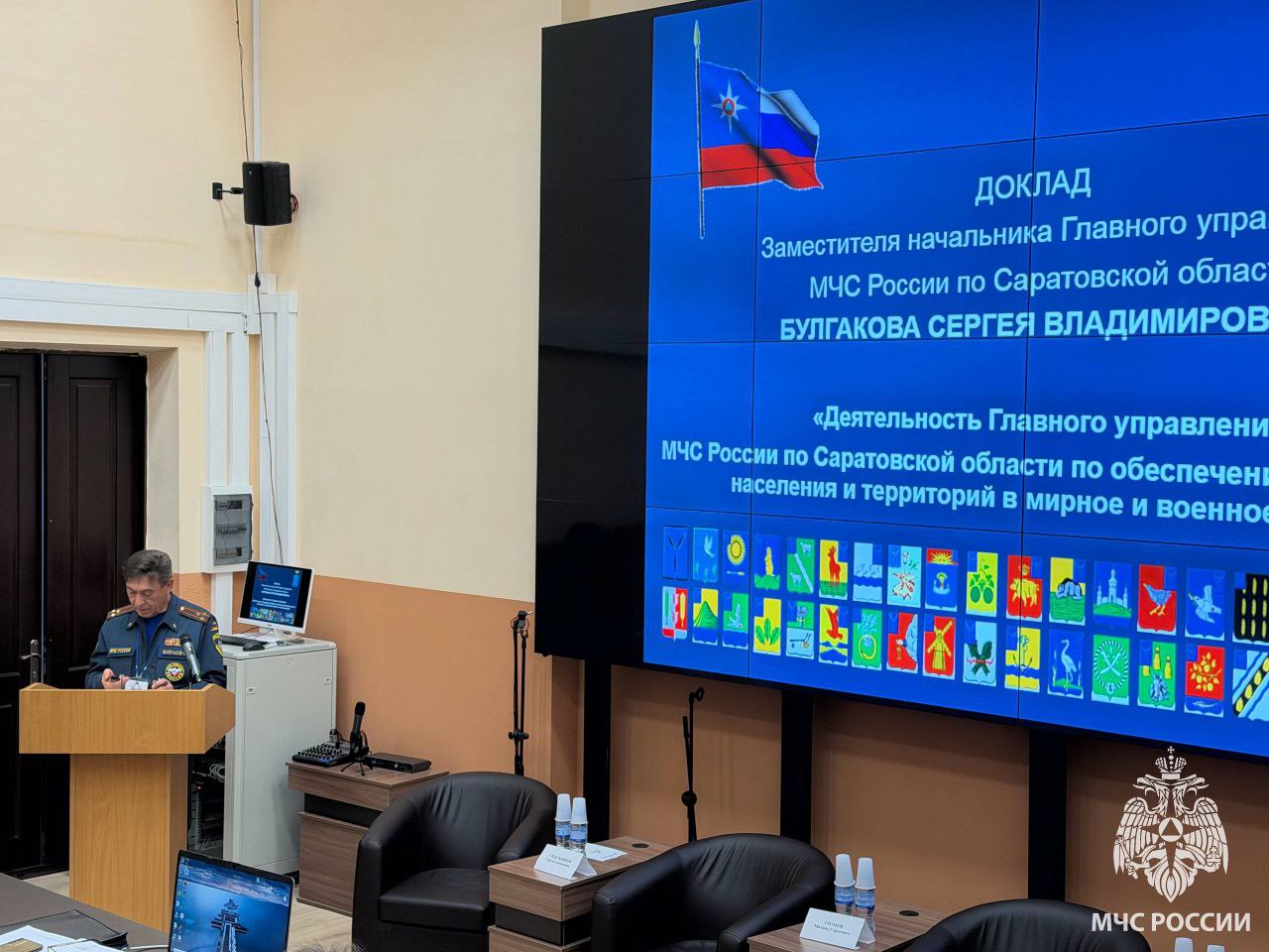 На конференции о деятельности ГУ МЧС России по Саратовской области в рамках программы обеспечения безопасности населения и территорий в мирное и военное время рассказал заместитель начальника управления по гражданской обороне и защите населения Сергей Булгаков.