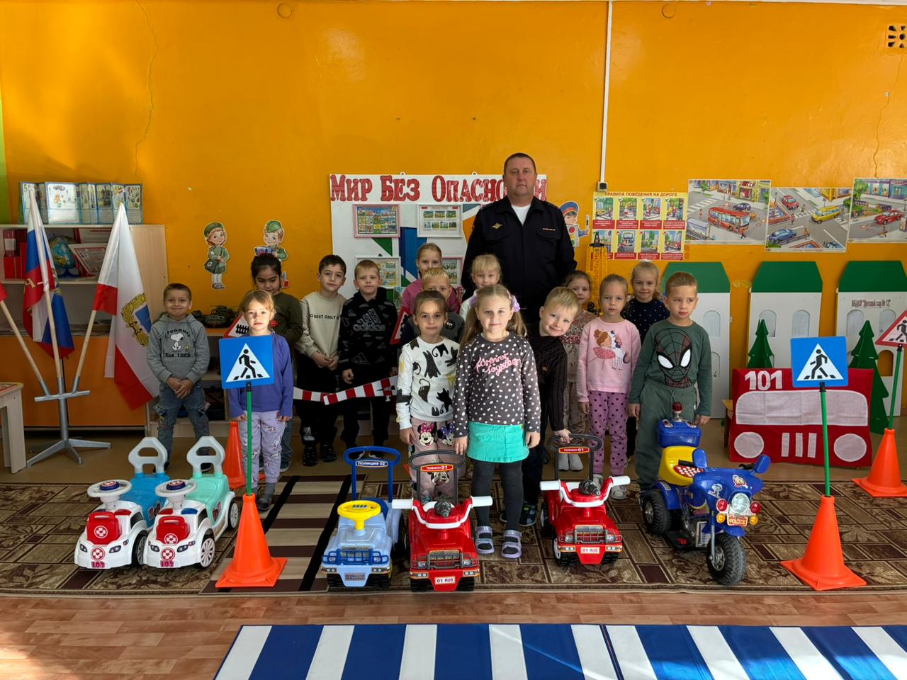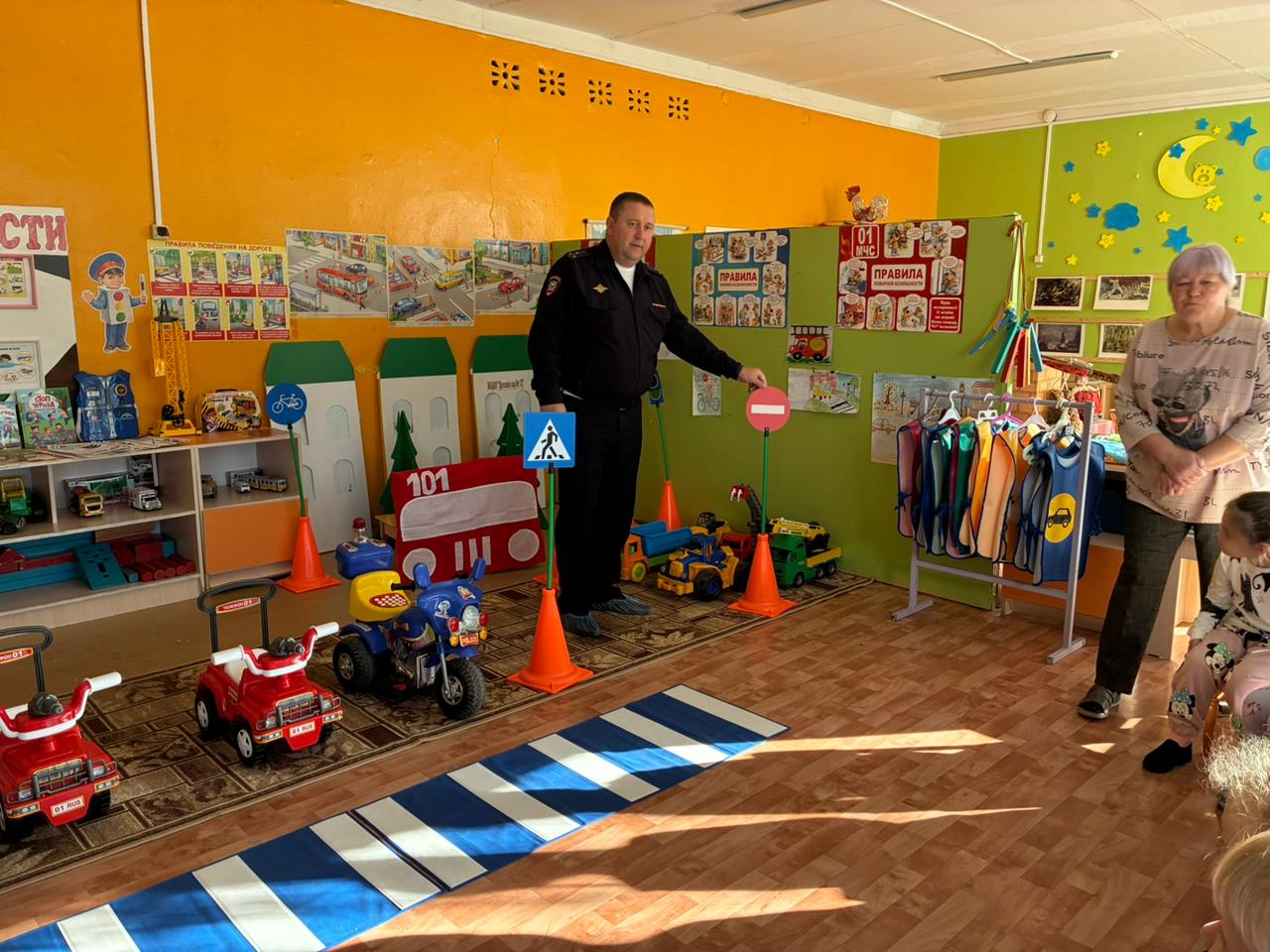 Рассказали детям о значении дорожных знаков и сигналов светофора, о поведении в общественном транспорте и в автомобилях, о недопущении игр вблизи проезжей части и на ней.