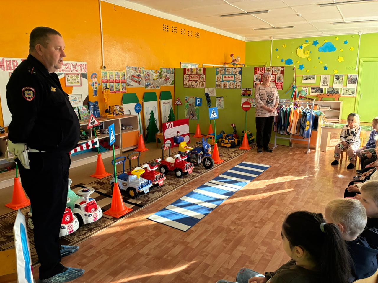 Полицейские рассказали детям о важности соблюдения правил дорожного движения, провели с детьми познавательную беседу о том, как правильно вести себя на проезжей части дороги, какие правила необходимо соблюдать пешеходу, чтобы не стать участником дорожно-транспортного происшествия.