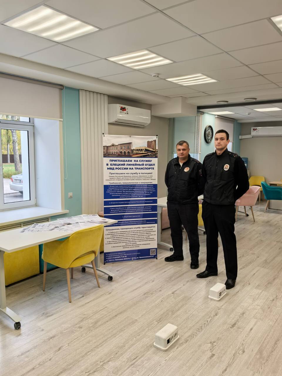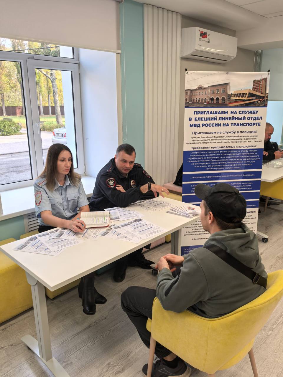Представители Елецкого ЛО МВД России на транспорте вышли с инициативой прямо к тем, кто ищет работу. Встреча с соискателями прошла в стенах городского центра занятости «Работа России» и собрала разнообразную аудиторию: от студентов и пенсионеров до участников СВО и людей, желающих кардинально сменить профессию.