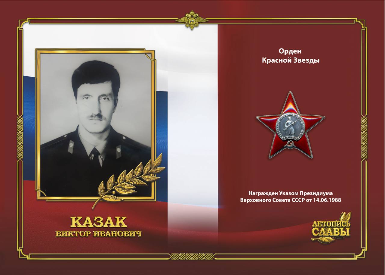 Сержант милиции Казак Виктор Иванович (15.11.1956 – 30.01.1988). Родился в поселке Возрождение Хвалынского района Саратовской области. Там окончил 10 классов, был призван в армию.