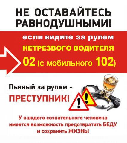 Госавтоинспекция в очередной раз призывает неукоснительно соблюдать правила дорожного движения! Алкоголь и вождение – не совместимы! Если вы обладаете информацией о водителе, который находится в состоянии опьянения за рулем транспортного средства – незамедлительно сообщите об этом ближайшему наряду ДПС или по телефону 02 (с мобильного – 102).