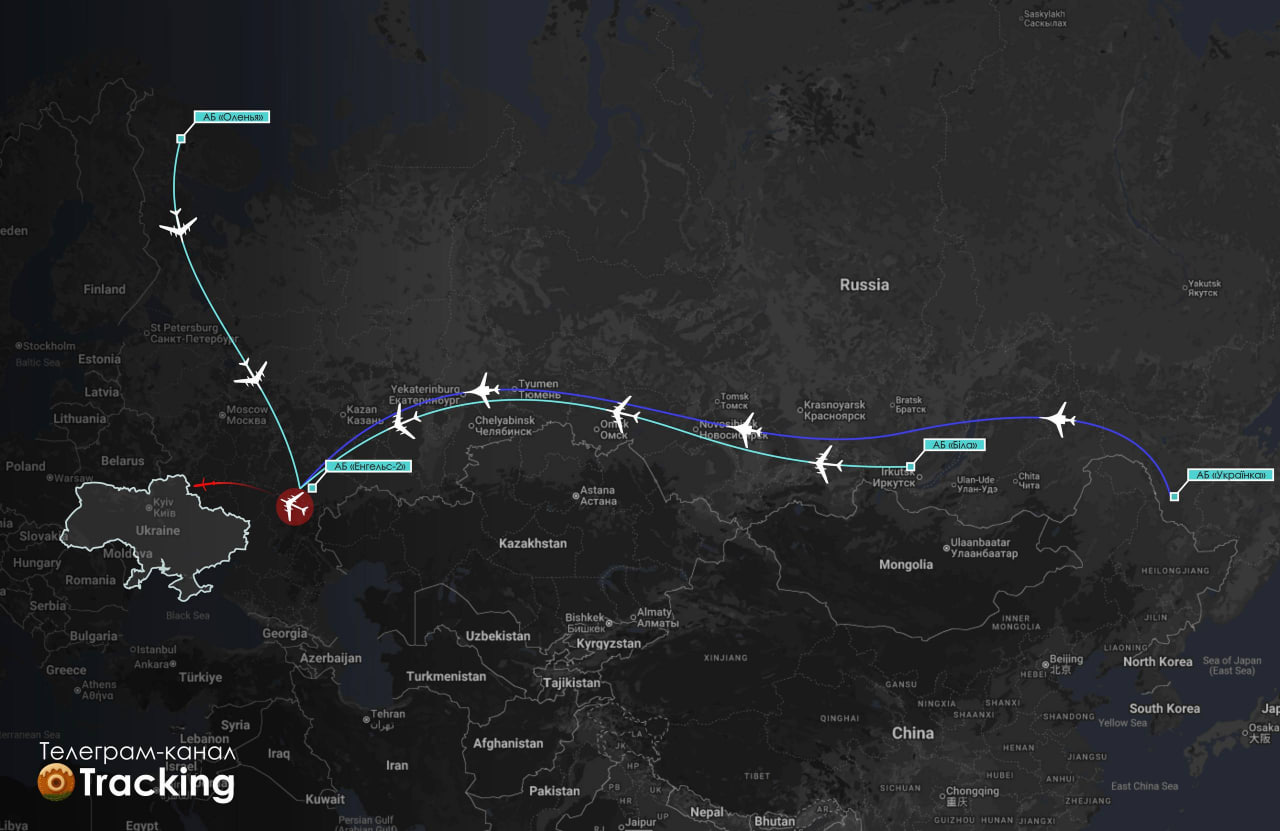11 самолётов Ту-95МС и Ту-160 действовали с двух авиабаз на Дальнем Востоке "Украинка" и "Белая", на Севере "Оленья" и Западе "Энгельс-2", пишут мониторинговые ресурсы противника.