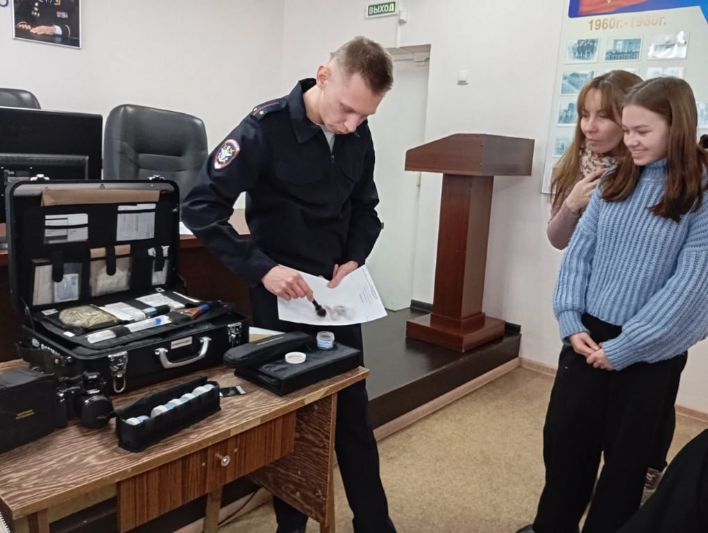 Эксперт-криминалист младший лейтенант полиции Евгений Жирков рассказал, для чего служит каждый предмет, содержащийся в чемодане экспертов, и предложил ребятам попробовать самим снять отпечатки пальцев с заготовленного заранее предмета.