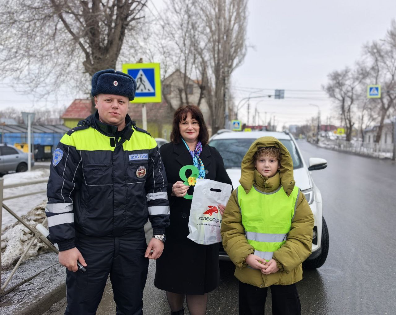 В Энгельсе юные инспекторы движения и полицейские поздравляли автоледи с #8Марта
