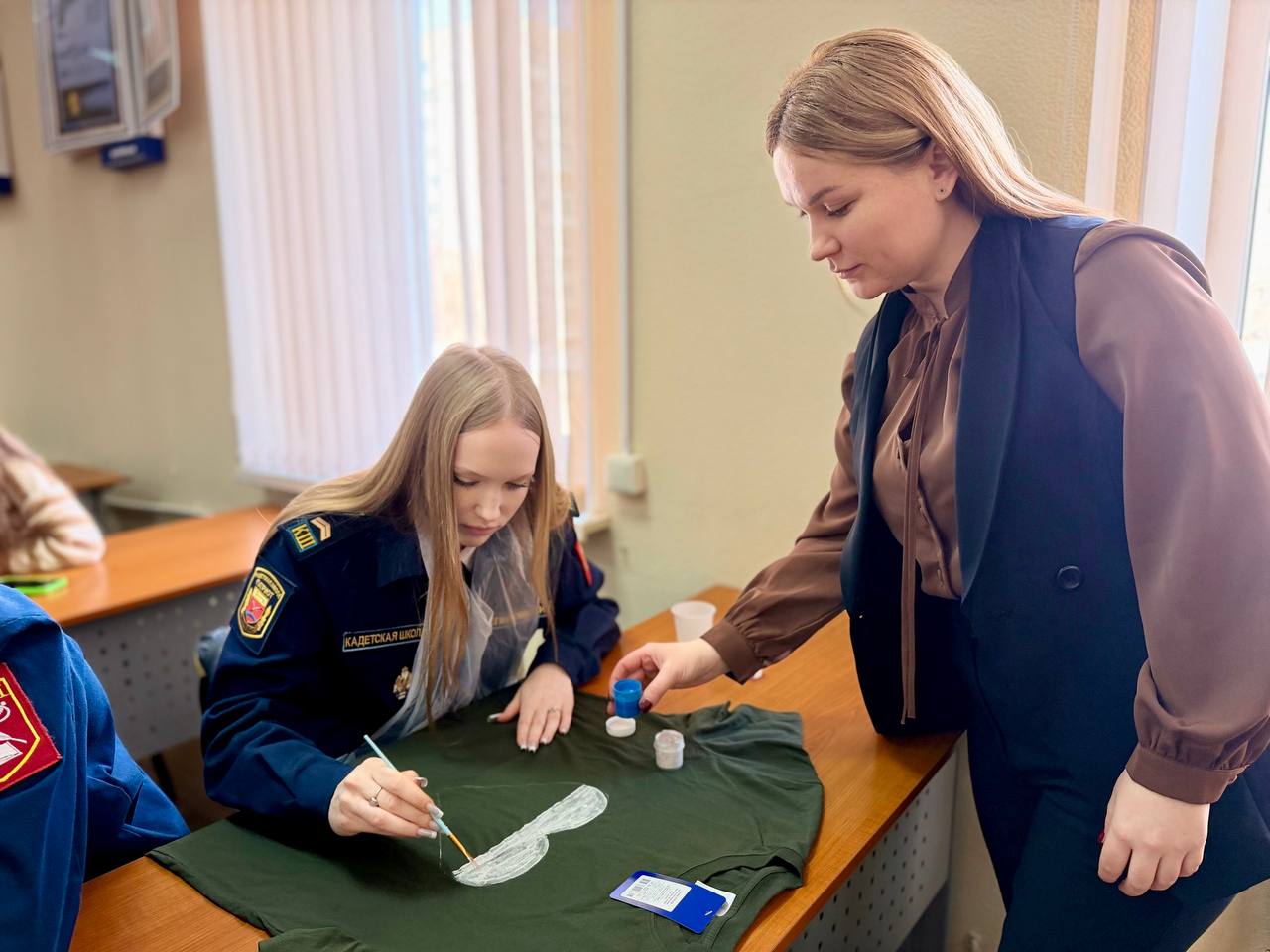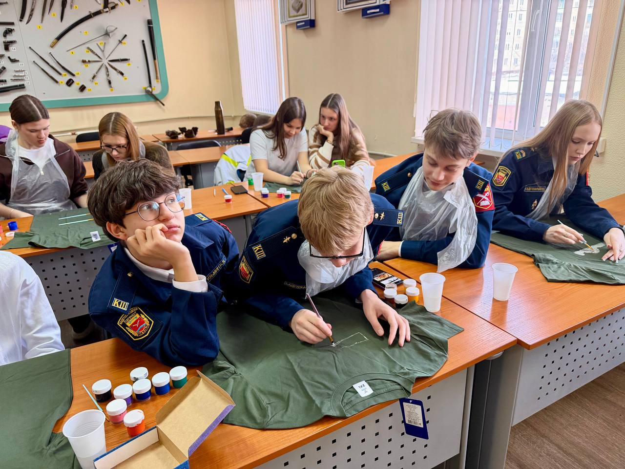 Представители Женского совета помогли ребятам изготовить открытки со словами благодарности и поддержки нашим военнослужащим в зоне проведения специальной военной операции, а также расписать футболки акриловыми красками.