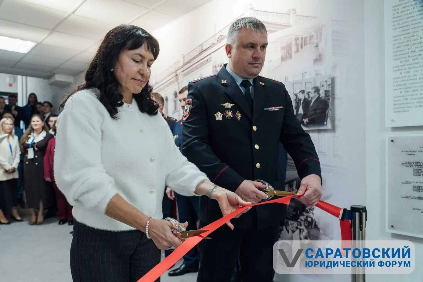 Почетное право перерезать красную ленту было предоставлено заведующей кафедрой криминалистики профессору, заслуженному юристу РФ Людмиле Шапиро и начальнику экспертнокриминалистического центра ГУ МВД России по Саратовской области Владимиру Евсееву.