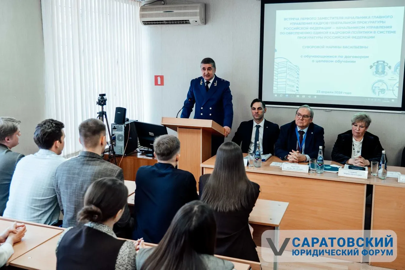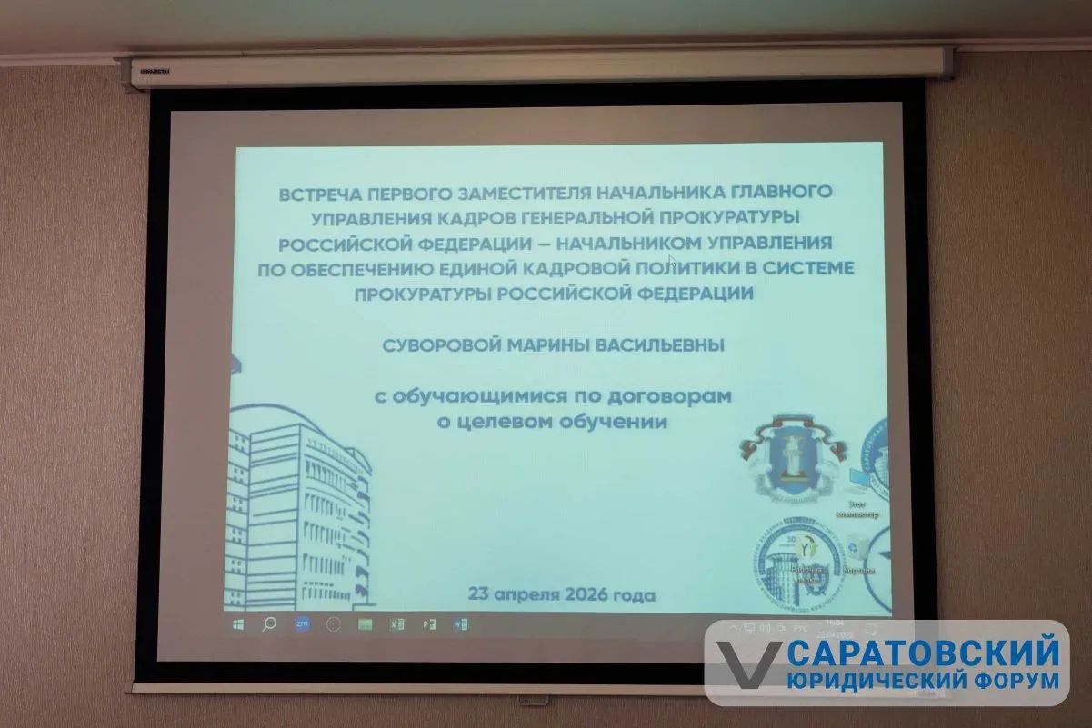 В Саратовской государственной юридической академии состоялась встреча Первого заместителя начальника Главного управления кадров Генеральной прокуратуры Российской Федерации Марины Васильевны Суворовой, ректора Университета прокуратуры Российской Федерации Игоря Михайловича Мацкевича и прокурора Саратовской области Сергея Владимировича Филипенко со студентами Института прокуратуры, обучающимися по договорам о целевом обучении, заключенным с прокуратурами субъектов Российской Федерации.
