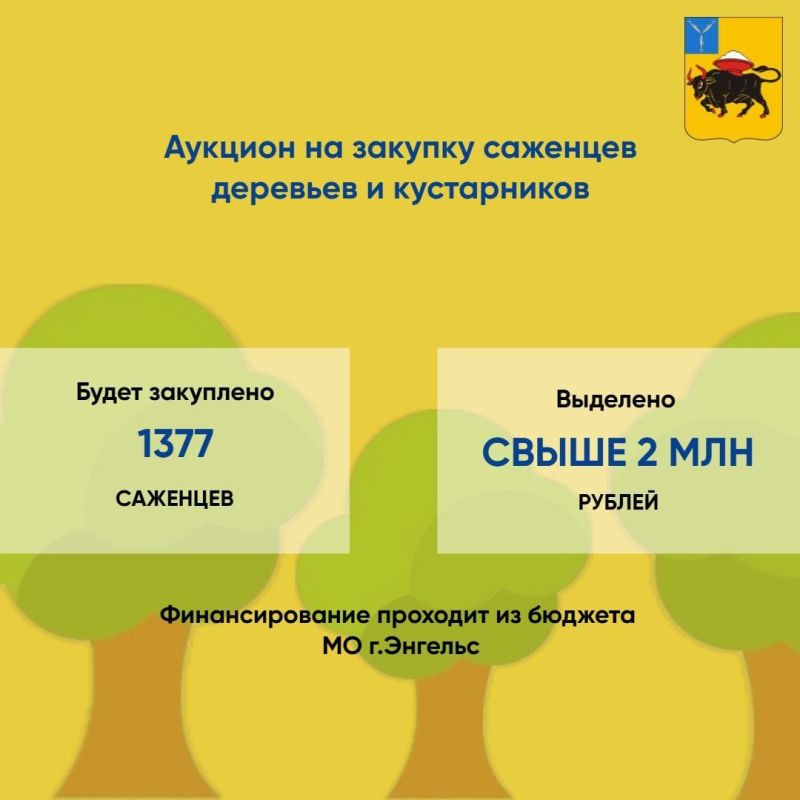 На закупку новых деревьев и кустарников для скверов МО г. Энгельс. В рамках аукциона будет поставлено и высажено 1377 новых саженцев на 6 общественных территориях. На указанные цели было выделено свыше 2 млн руб.Срок реализации проекта 4 квартал...