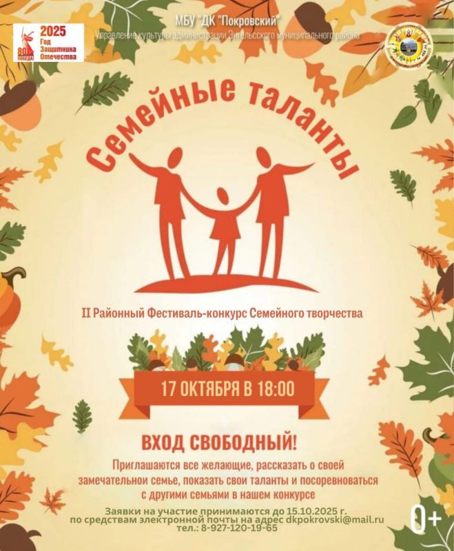 Приглашаем энгельсские семьи показать свою креативность и таланты на нашем фестивале.Когда:17 октября, начало в 18:00Место проведения:ДК «Покровский»: ул. Мясокомбината, дом №10б.У вас есть шанс стать участником конкурса и удивить...
