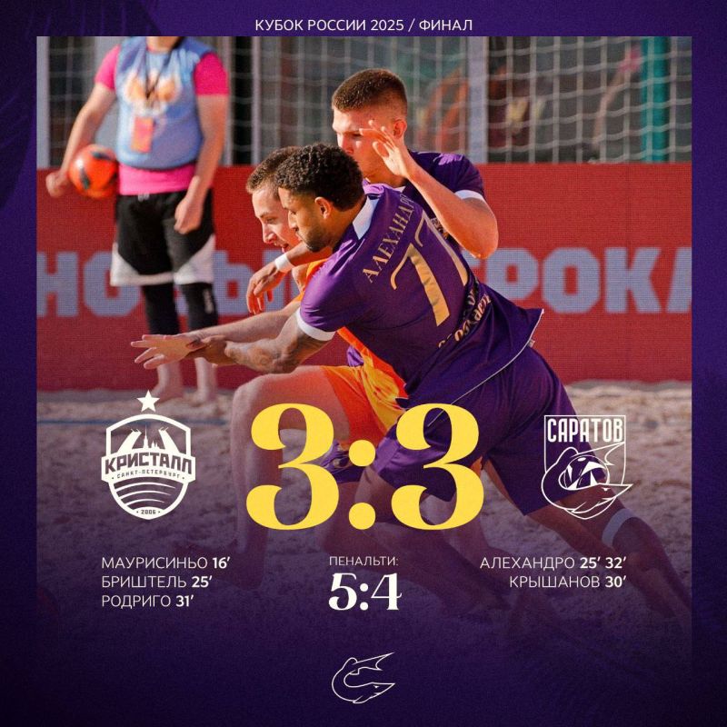 В финале Кубка России по пляжному футболу наши ребята выложились на полную. Основное время завершилось со счётом 3:3 — голами отличились Алехандро (дважды) и Николай Крышанов.В серии пенальти фортуна чуть-чуть отвернулась — 4:5 в пользу питерского...