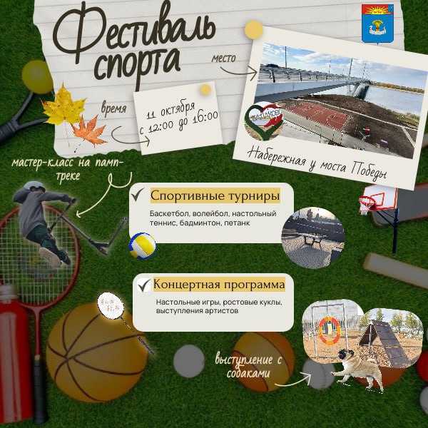 Жители и гости Балаково, приглашаем вас сегодня провести время на свежем воздухе! На набережной пройдут игры в баскетбол, теннис, волейбол и петанк. Вас ждут мастер-классы на памп-треке, выставка ремесленников, настольные игры, яркие номера артистов, концерты и показательные выступления с собаками на площадке для выгула животных.