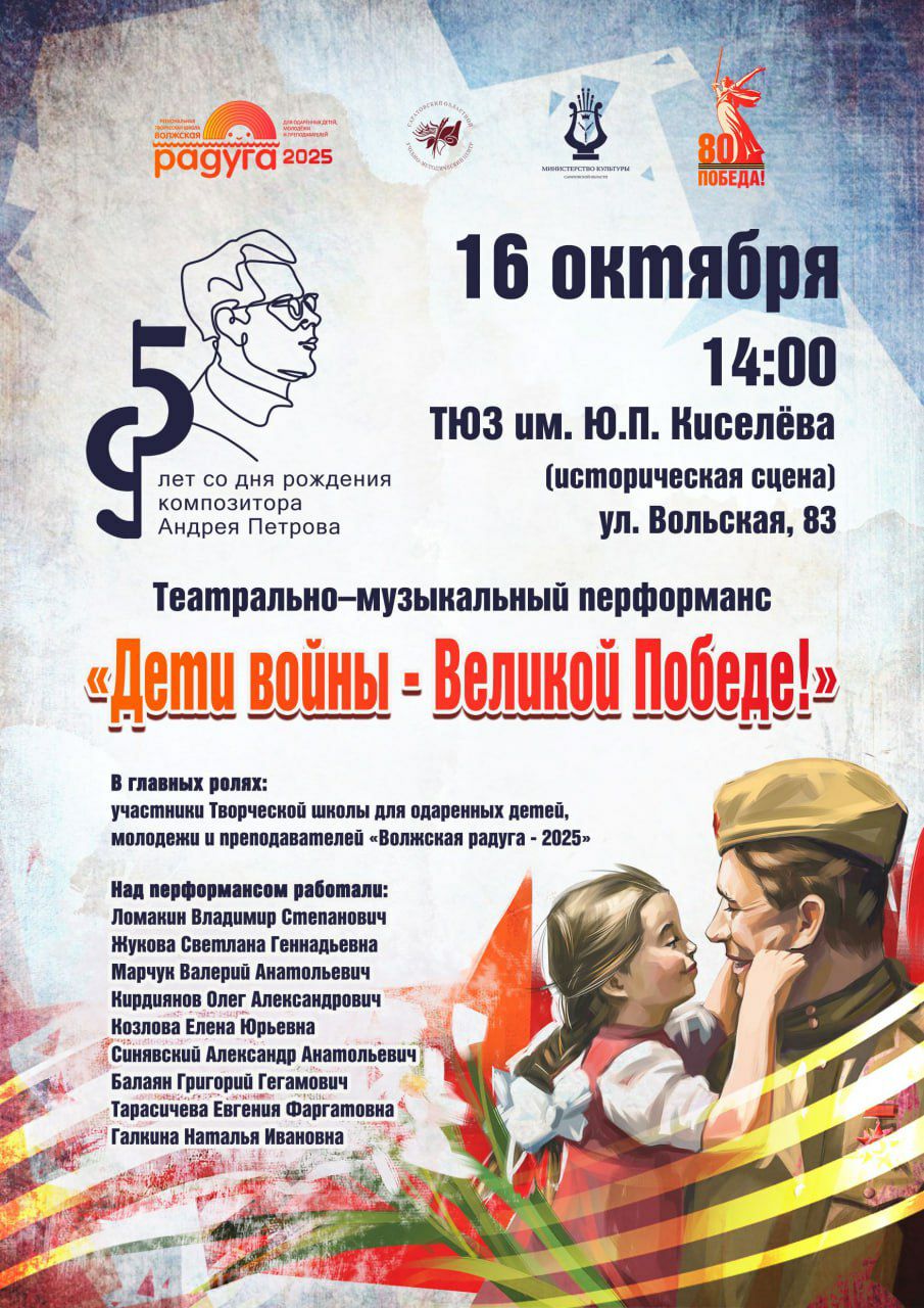 Показ театрально-музыкального перформанса «Дети войны – Великой Победе», созданный молодыми дарованиями Саратовской области – участниками региональной творческой школы для одаренных детей, молодежи и преподавателей «Волжская радуга» под руководством опытных педагогов, впервые состоялся летом 2025 года, а 16 октября 2025 года этот уникальный спектакль будет показан на исторической сцене Саратовского театра юного зрителя имени Ю.П. Киселева.