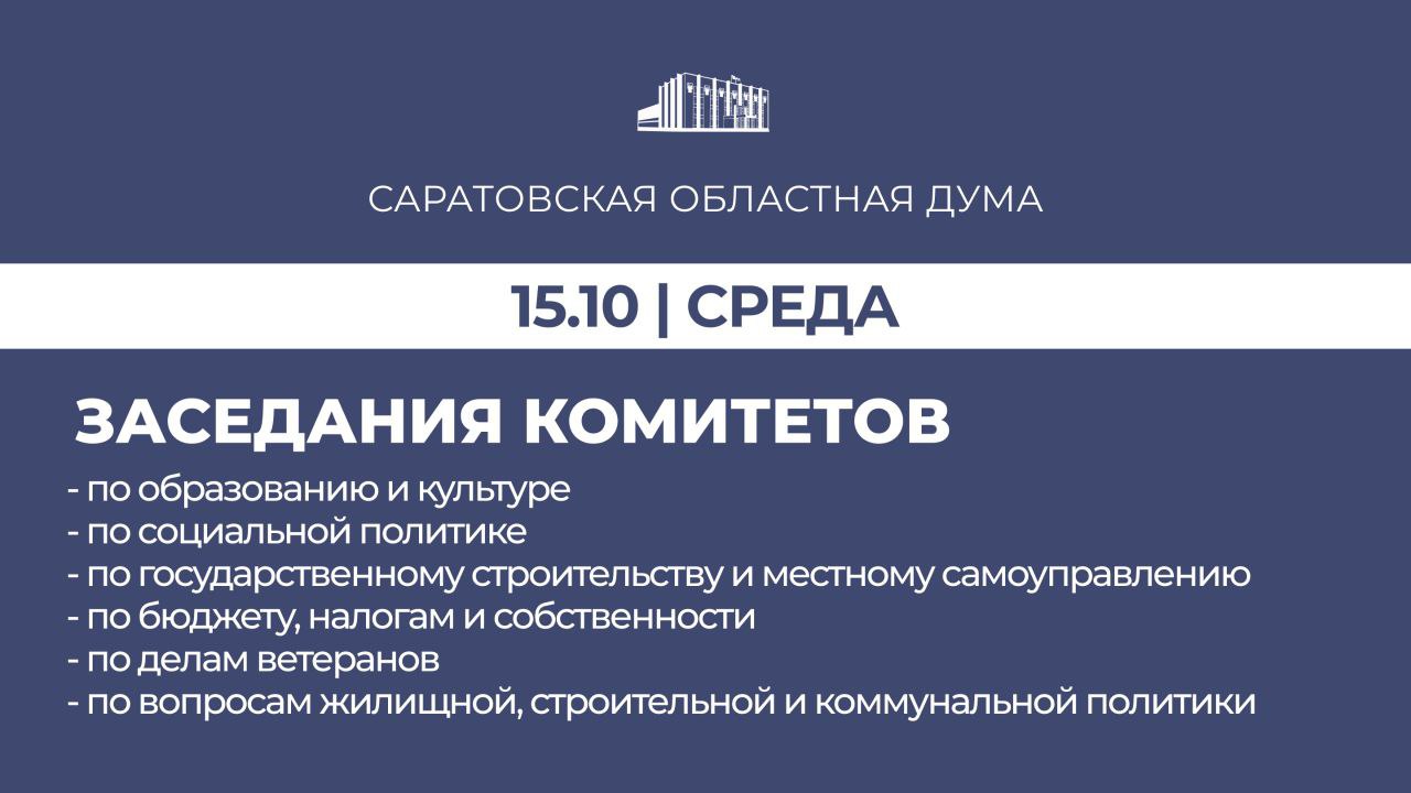 Завтра, 15 октября, в Саратовской областной Думе пройдут заседания комитетов: