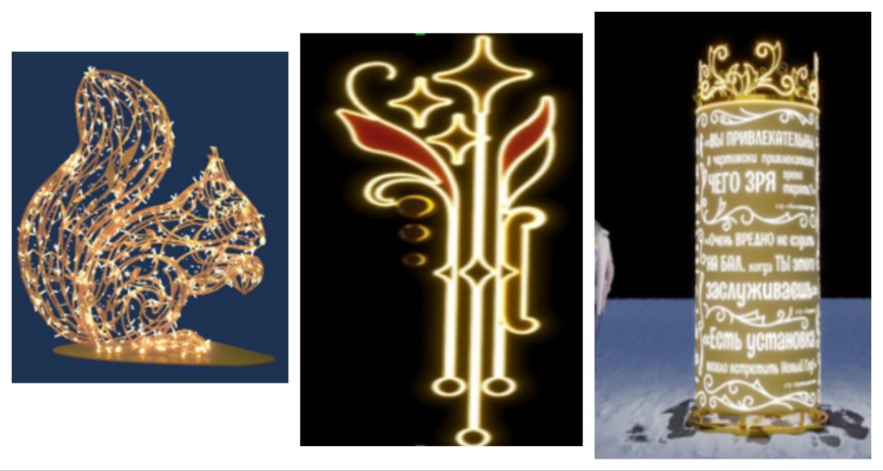 Предполагается установка фигуры «Белочки с орехом», пяти световых консолей «Золотая брошь», двух столбов с афишами пожеланий.
