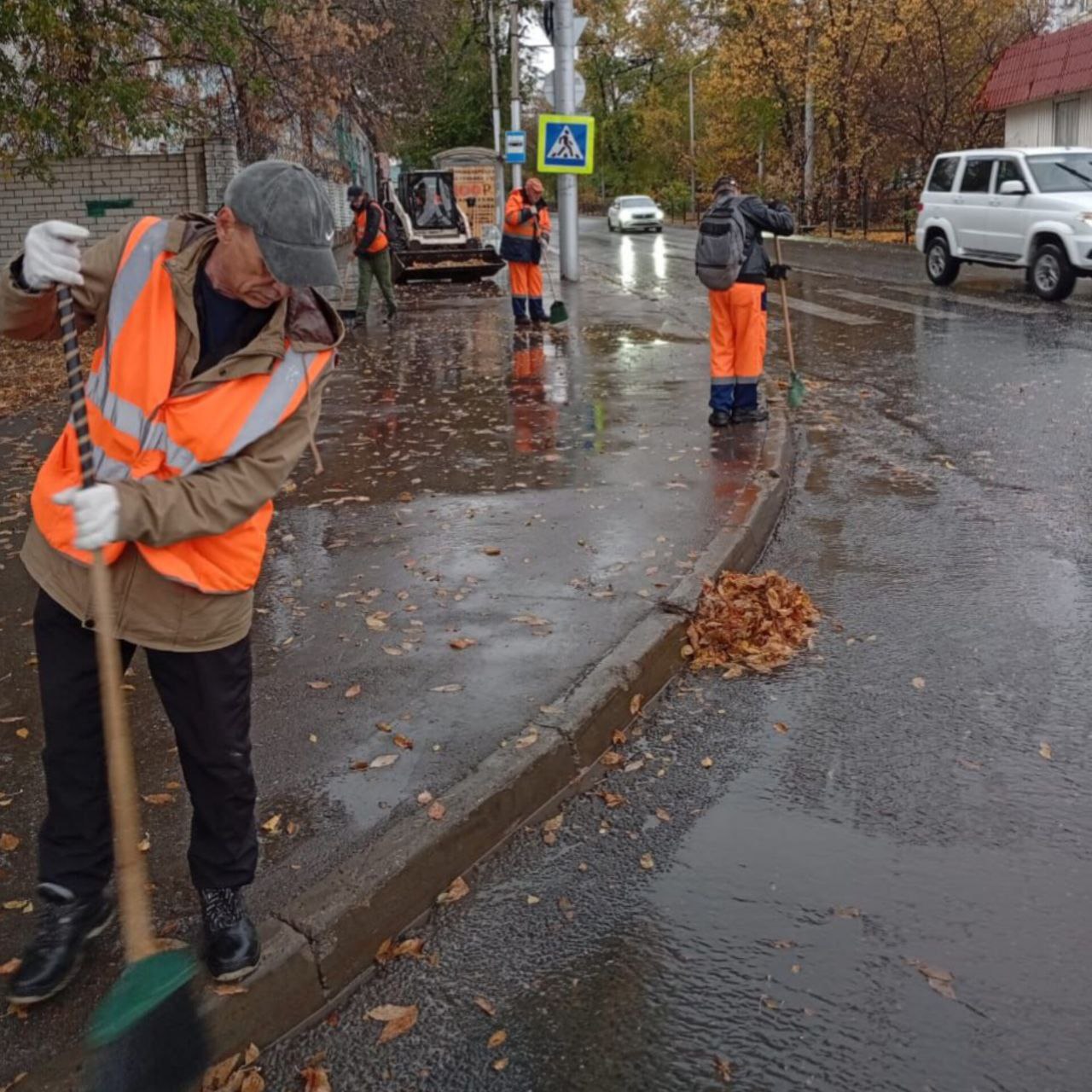 Коммунальные службы выполняют уборку дорожного полотна и пешеходных зон, мойку остановочных павильонов, подготовку цветников к зимнему периоду, сбор случайного мусора, опавшей листвы и другие работы