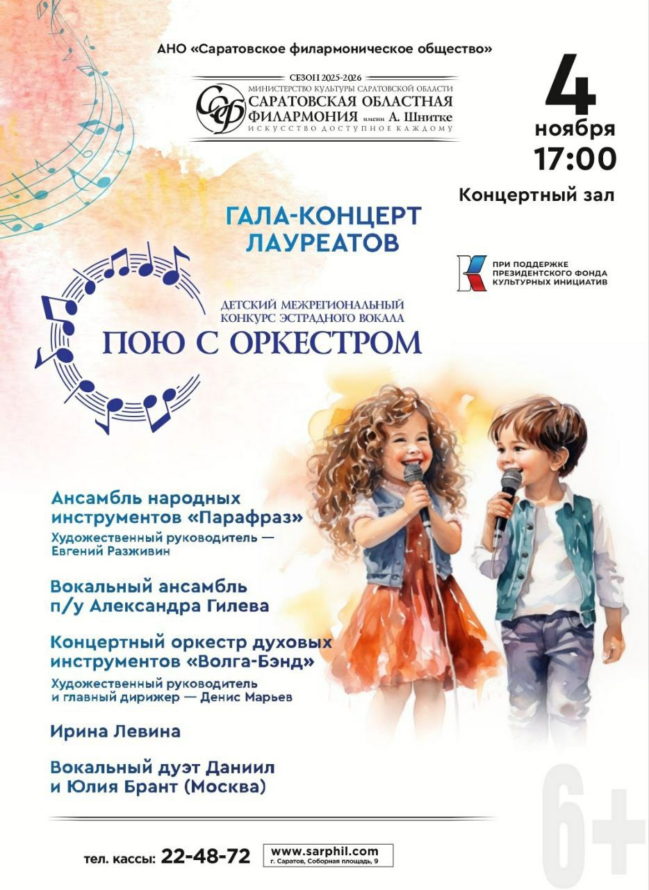С 1 по 4 ноября при поддержке Президентского фонда культурных инициатив пройдет детский межрегиональный конкурс эстрадного вокала «Пою с оркестром», организатором которого является Саратовское филармоническое общество.