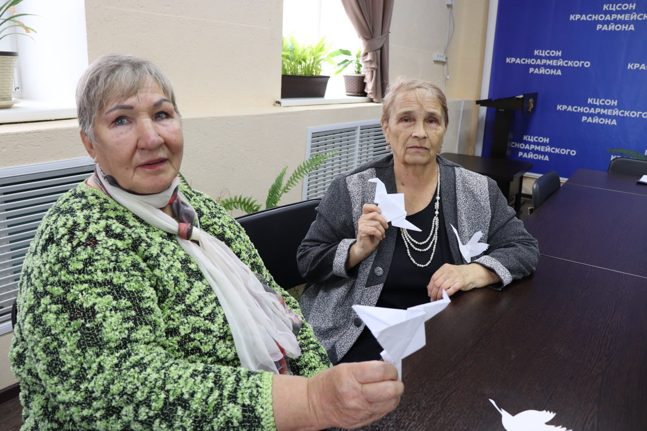 На литературном часе в красноармейском центре соцобслуживания обсуждали произведения, посвященные теме мира, делились своими мыслями о важности сохранения исторической памяти. Также на творческом мастер-классе получатели услуг вырезали белых журавлей из бумаги.