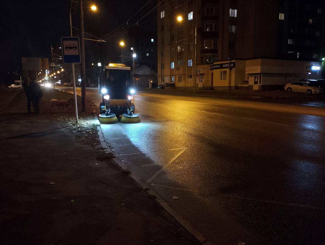 МКУ «Городское хозяйство продолжает работы по приведению в порядок улично-дорожной сети в круглосуточном режиме. Именно поэтому в ночное время можно часто заметить работу специальной тротуароуборочной техники.