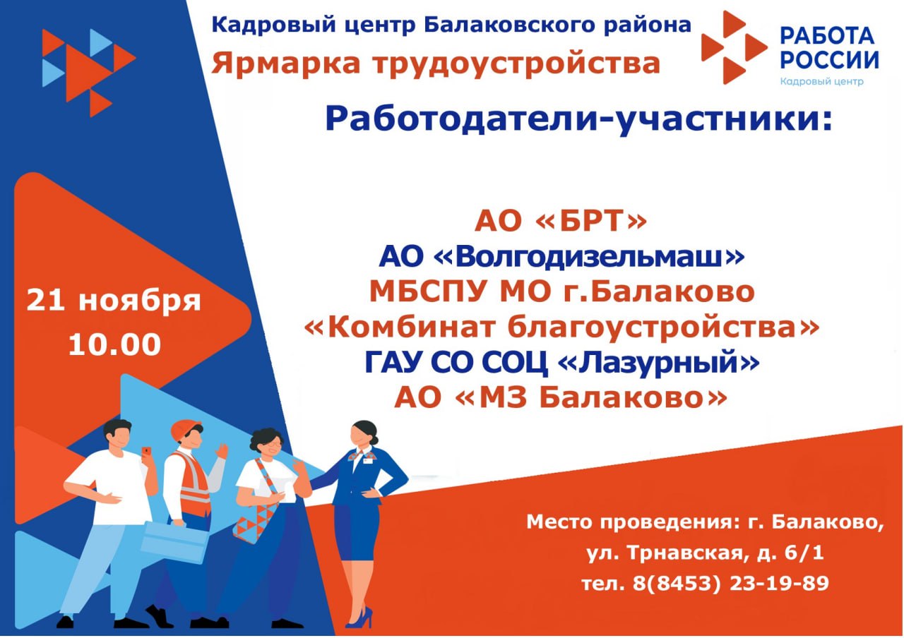 В эту пятницу, 21 ноября, в 10:00 в кадровом центре Балаковского района состоится Ярмарка трудоустройства.