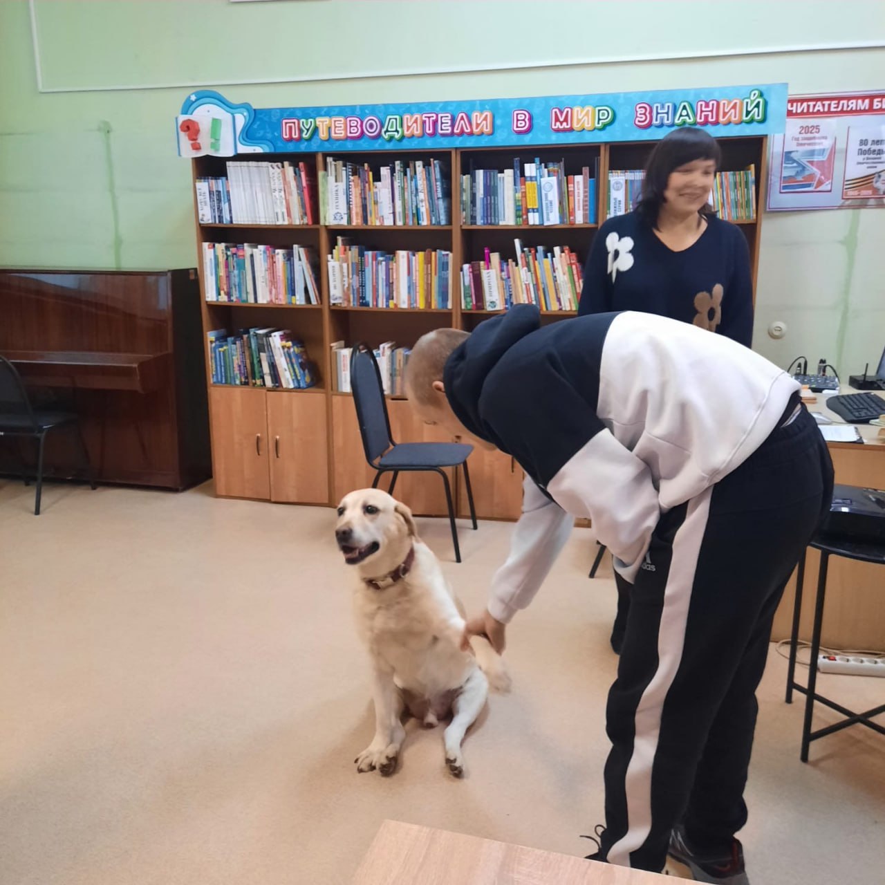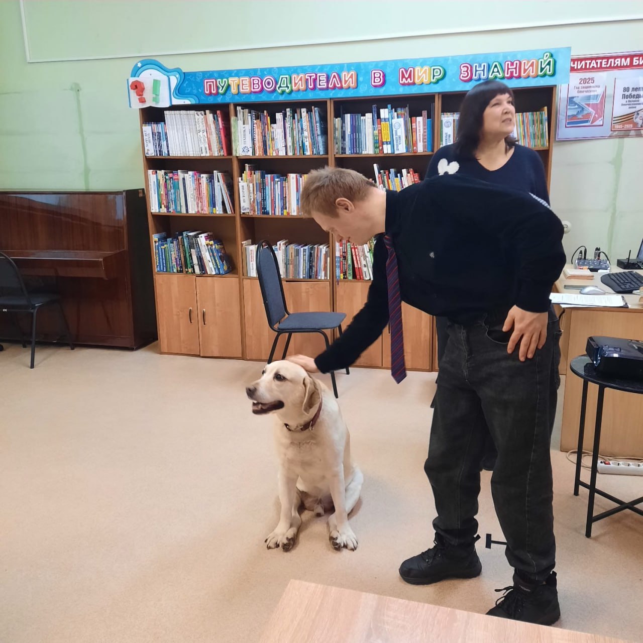 Далее гостей ждала уникальная встреча. Они познакомились с собакой-поводырем по кличке Винс. О его выдающихся способностях рассказала хозяйка Любовь Александровна, инвалид по зрению. Пес помогает хозяйке в быту, сопровождает ее на прогулках и знает множество команд. У гостей была возможность поиграть с Винсом, оценить его уникальные способности и задать хозяйке интересующие их вопросы.