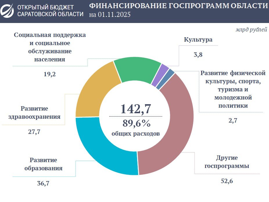 На финансирование 20 государственных программ Саратовской области за деcять месяцев 2025 года направлено 142,7 млрд рублей, или 89,6% от совокупных расходов областного бюджета.
