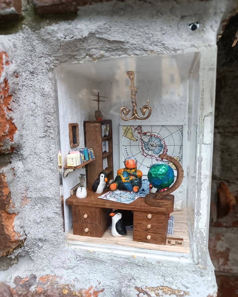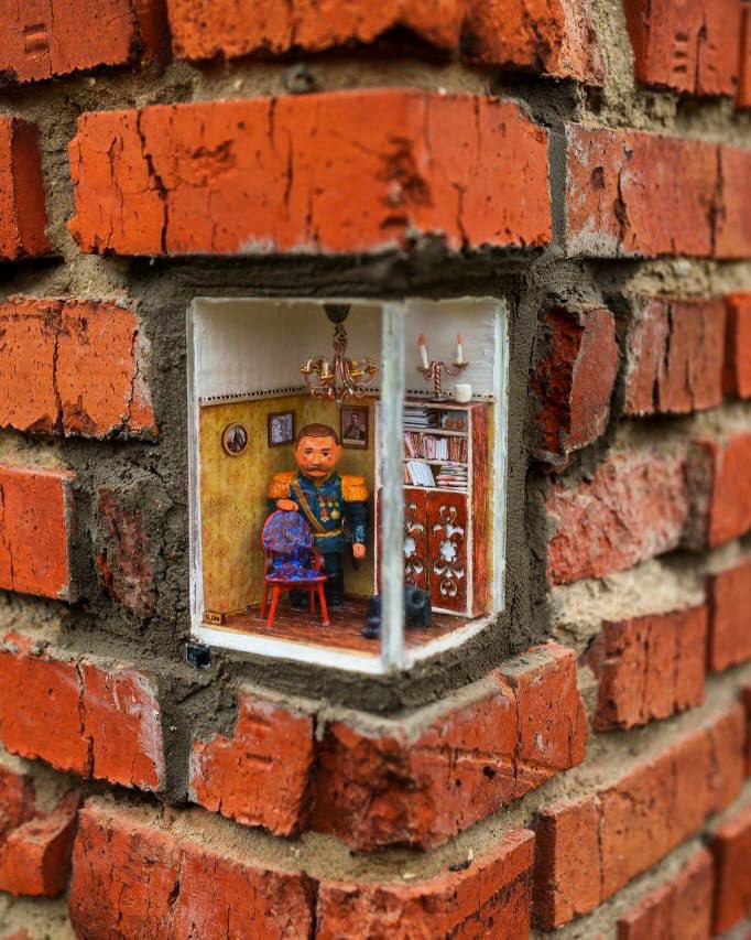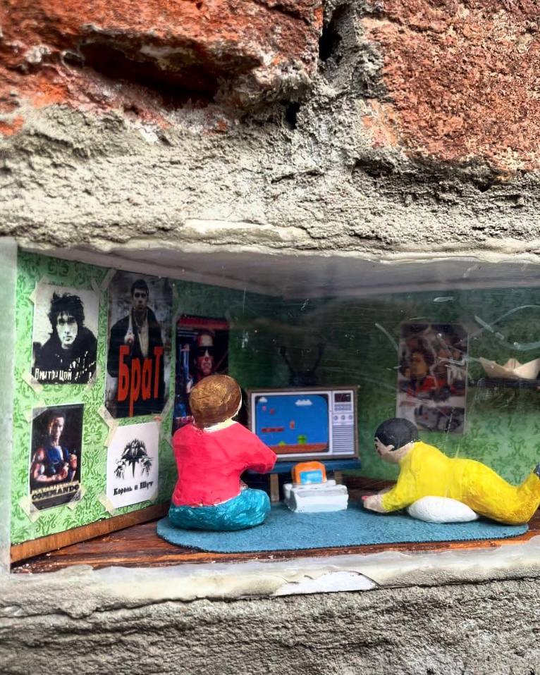 Вот такие милые и привлекательные миниатюры вместо вынутых кирпичей делают в стенах домов в Адлере, Новокузнецке, Иркутске, Тюмени, Обнинске, Симферополе.