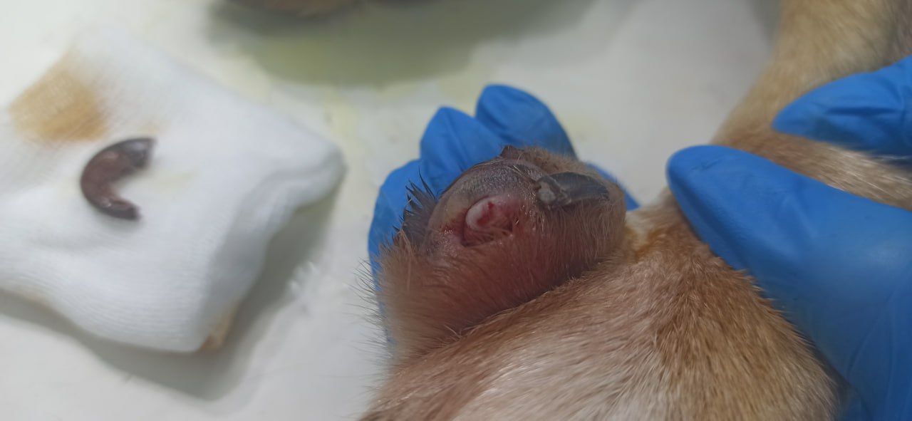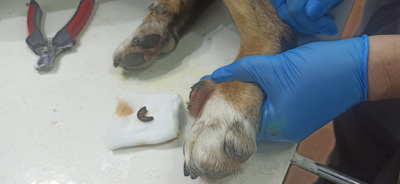 Ветеринары удалили вросший коготь Стрелке. Дефект подушечки обработали. Хозяину дали рекомендации по уходу.