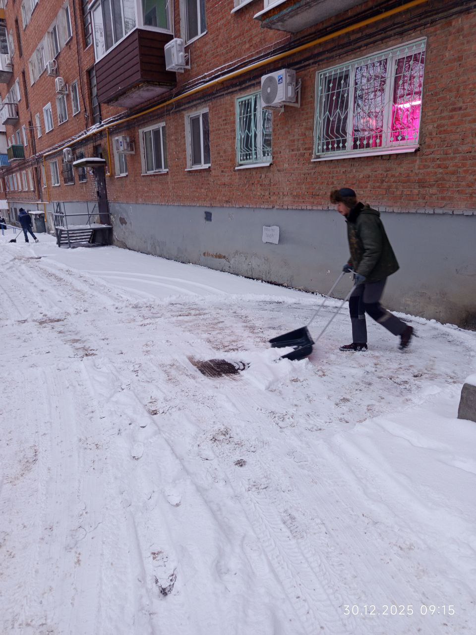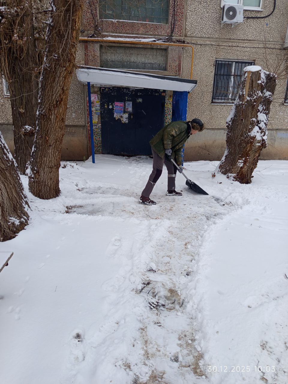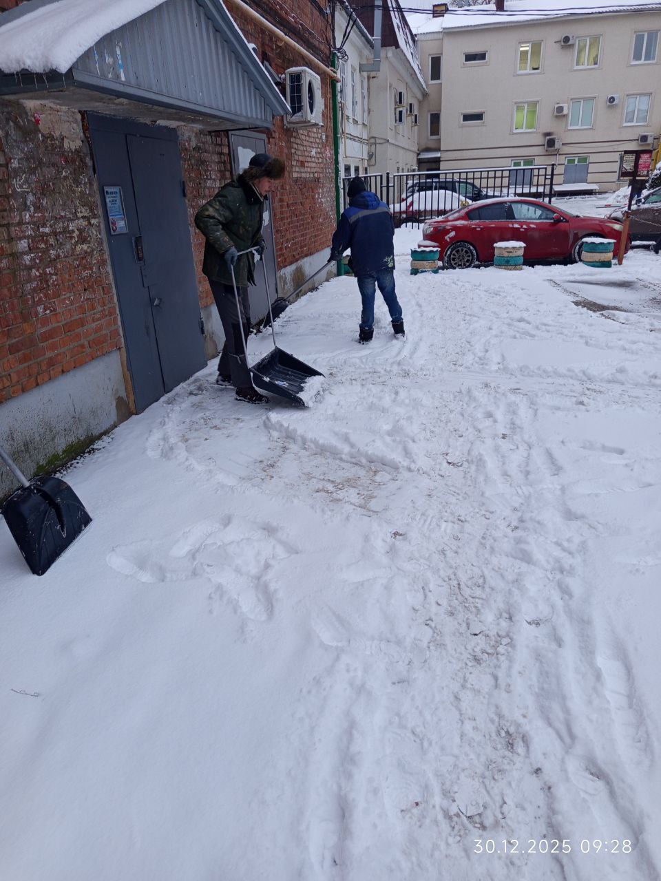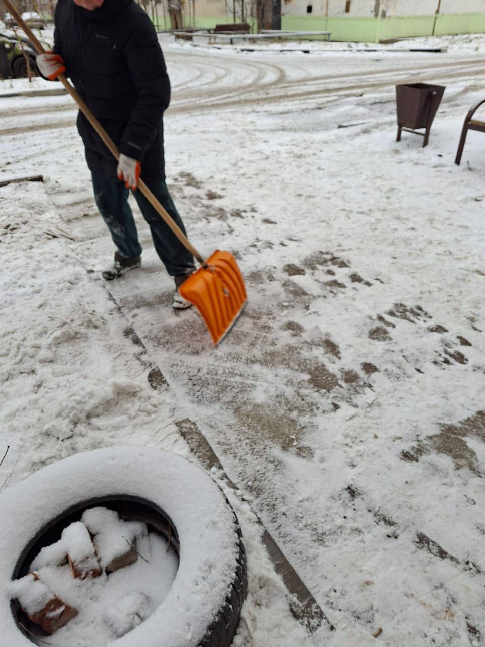 С раннего утра дворники расчищают от снега пешеходные зоны во дворах, при необходимости задействуется снегоуборочная техника.