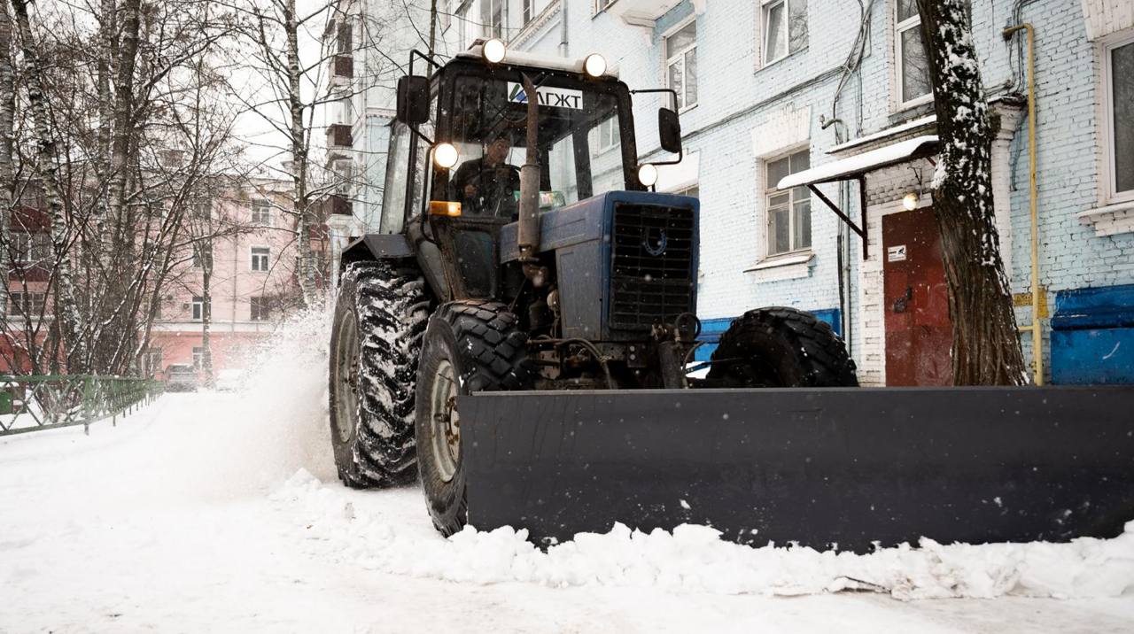 Общий план — машина во дворе, следы сброшенного снега, оставленная техника или инструменты (лопаты).