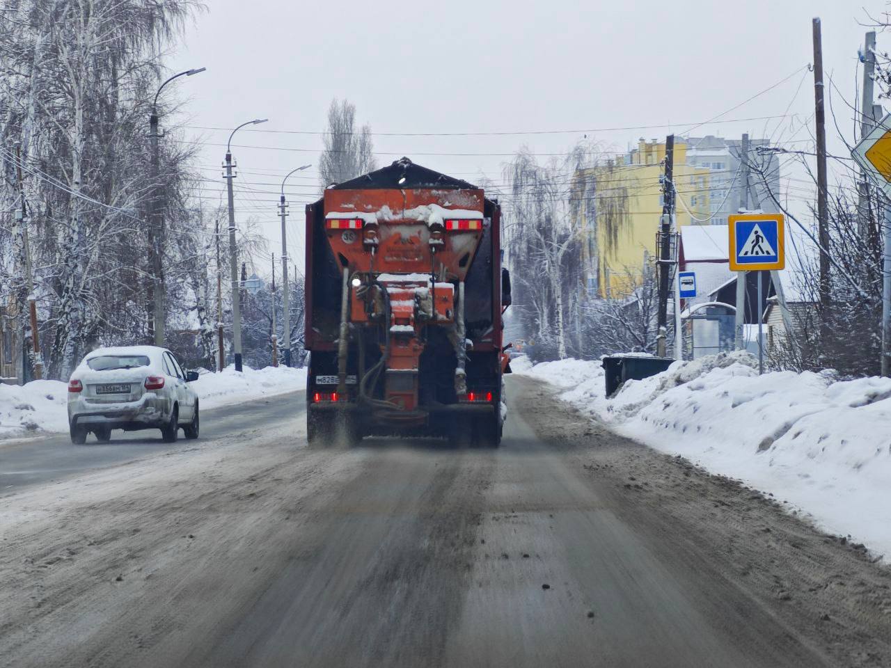 Коммунальная техника применяет пескосоляную смесь для обработки автомобильных дорог.
