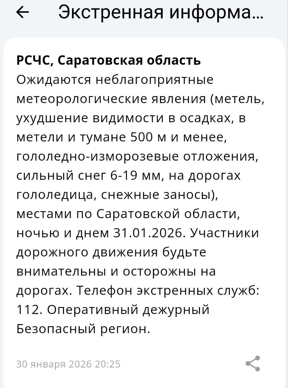 Экстренная информация РСЧС*: Ожидаются неблагоприятные метеорологические явления (метель, ухудшение видимости в осадках, в метели и тумане 500 м и менее, гололедно-изморозевые отложения, сильный снег 6-19 мм, на дорогах гололедица, снежные заносы), местами по Саратовской области, ночью и днем 31.01.2026, сказано в уведомлении.