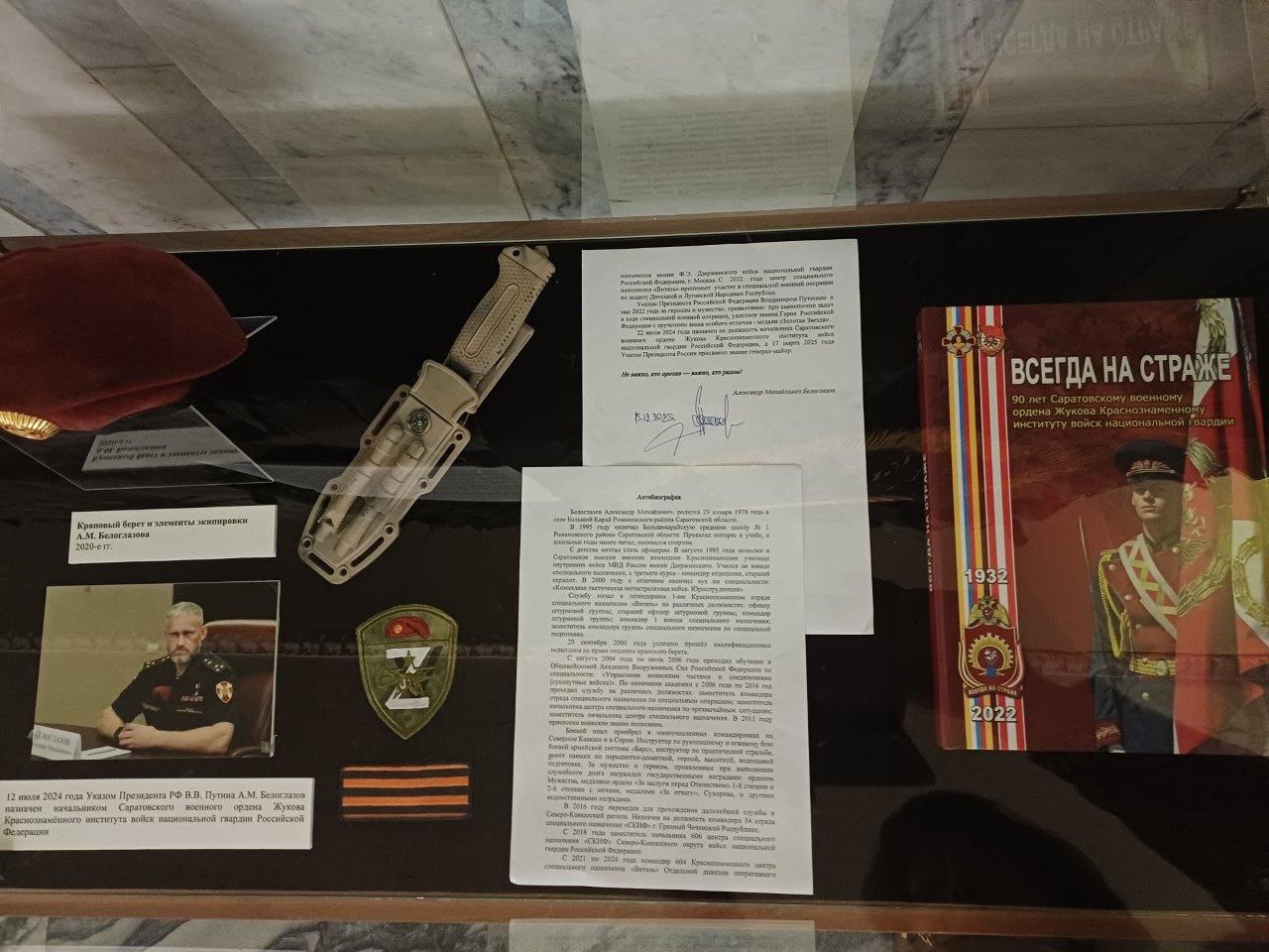 26 февраля в Саратовском областном музее краеведения состоялось открытие выставки «Не важно, кто против – важно, кто рядом!». Она рассказывает о Герое России генерал-майоре Александре Михайловиче Белоглазове – начальнике Саратовского военного ордена Жукова Краснознаменного института войск национальной гвардии Российской Федерации.