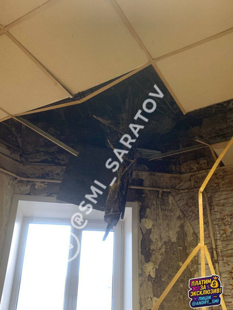 На улице Яблочкова, 1 обвалилась часть потолка в одной из квартир. Случилось это после того, как с крыши счистили снег — сначала просто текло, потом штукатурка посыпалась, а затем и часть перекрытия рухнула. Теперь видно деревянные балки и мусор.