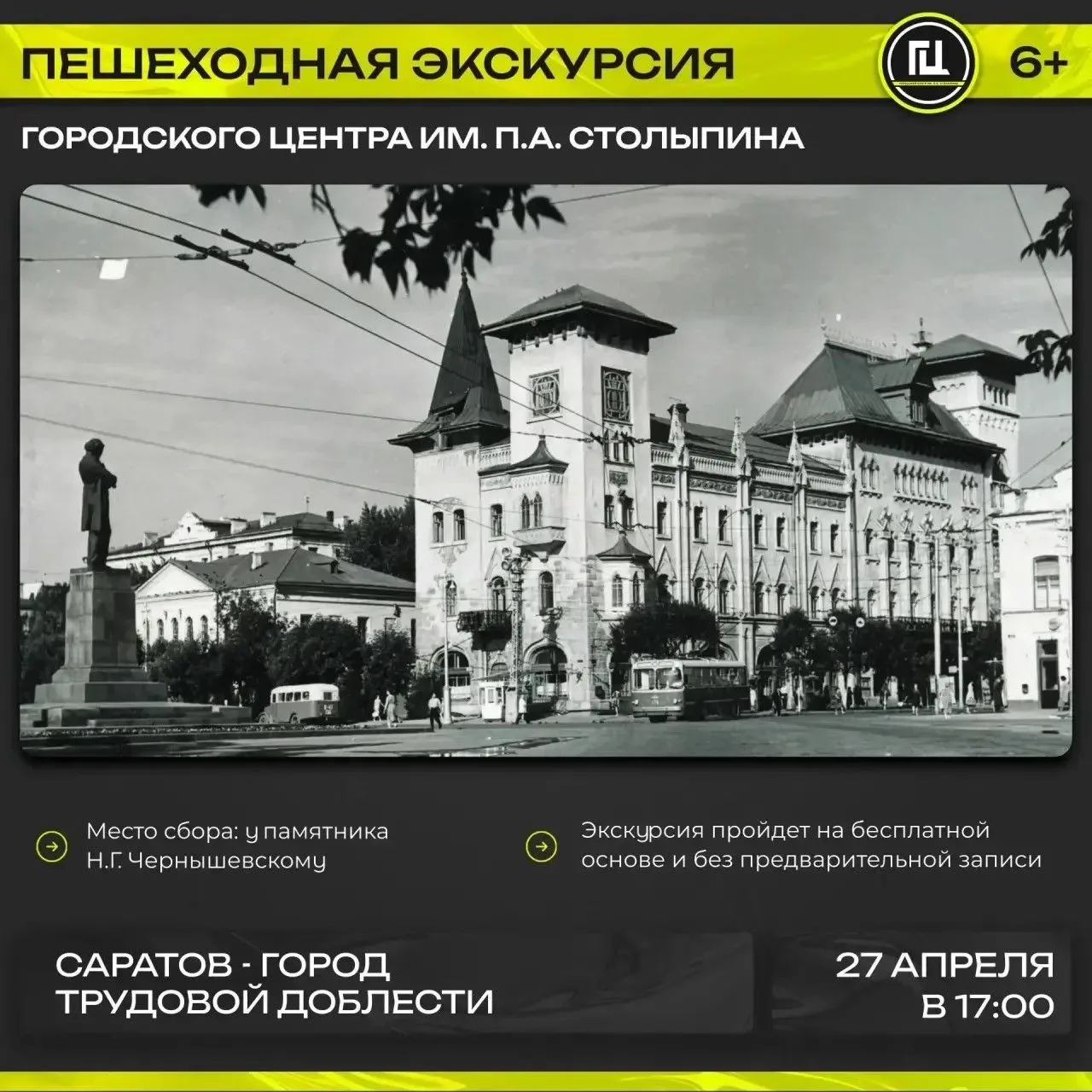 Экскурсия состоится 27 апреля в 17:00. Всех желающих будут ждать у памятника Н.Г. Чернышевскому.