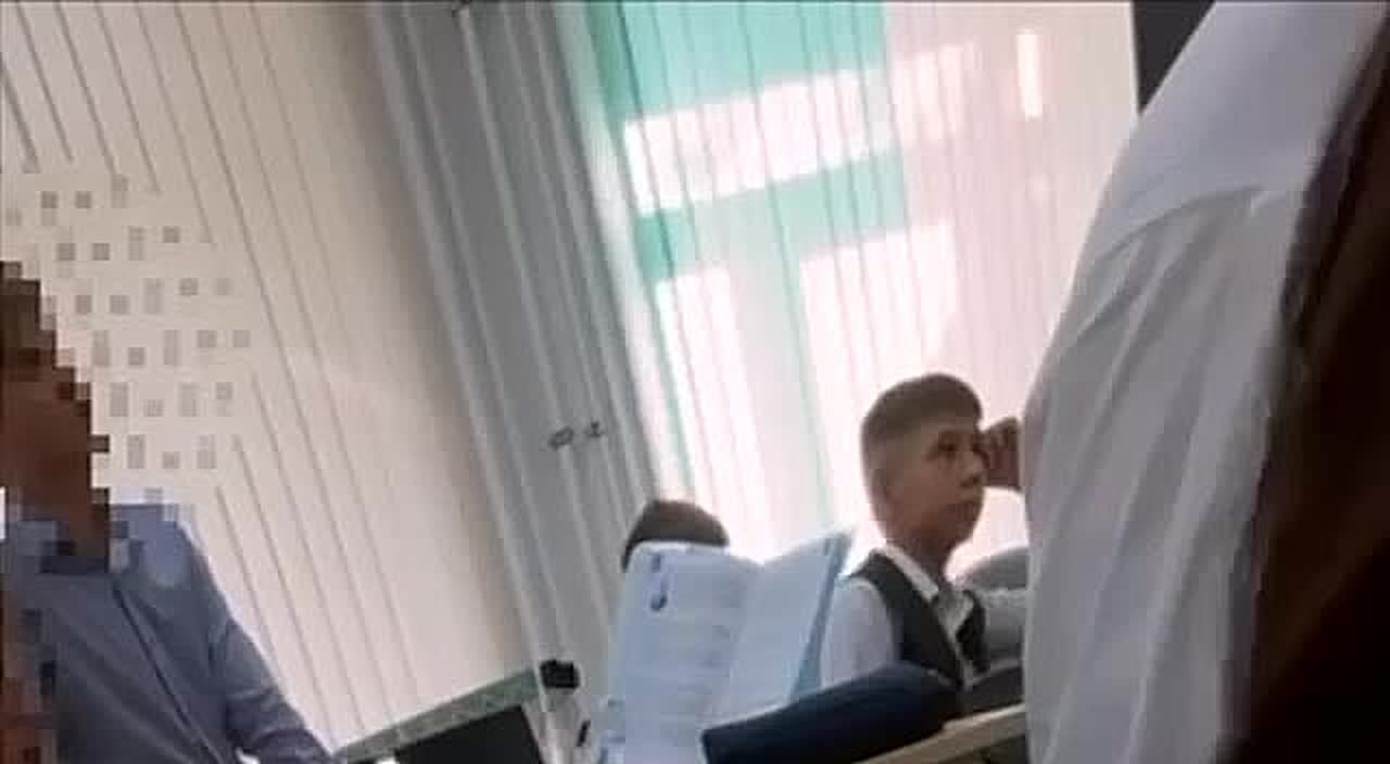 Где-то на заднем плане учительница просит неадеквата прекратить. Где в этот момент была охрана школы в которую проник агрессивный семьянин не понятно.