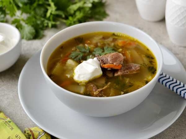 4. В самом конце к супу можно добавить вареное мясо, нарезанный свежий укроп и дать закипеть. Подают горячим, желательно добавив по ложечке сметаны для смягчения вкуса.