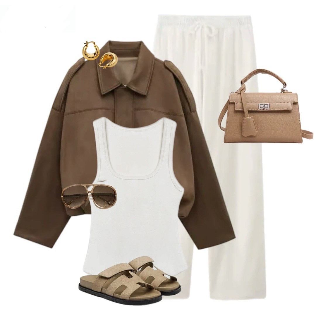 Представленный комплект вдохновлен оттенками капучино и состоит из шоколадной верхней одежды, молочных брюк и ванные топа. Песочные аксессуары и золотые детали завершают этот элегантный ансамбль. Рассмотрим каждую деталь более подробно: