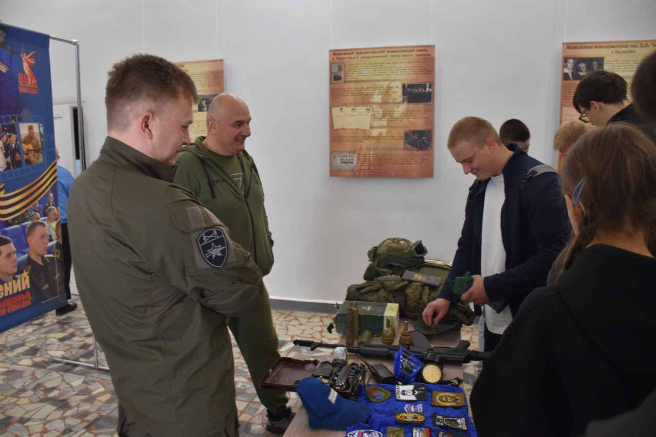 Встреча была приурочена к Году Защитника Отечества и 80-летию Победы в Великой Отечественной войне. Перед ее началом гости могли ознакомиться с выставкой образцов вооружения, в том числе трофеев с полей специальной военной операции, которую организовали волонтеры Саратовской Ассоциации Героев.