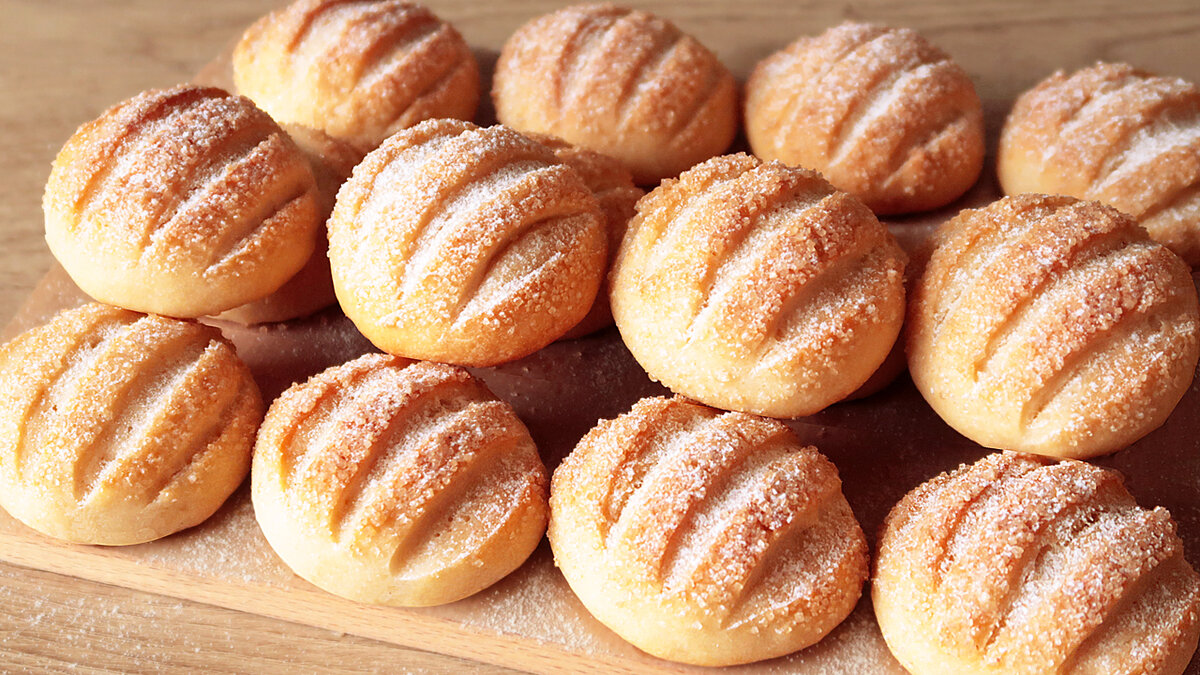 Разделите готовое тесто на две части. Каждую часть скатайте в валик и нарежьте примерно на 8 одинаковых кусочков. Округлите их и выложите на противень, застеленный пергаментом. Затем обваляйте каждую заготовку в сахаре и сделайте небольшие надрезы острым ножом для красивой «розетки» после выпекания.