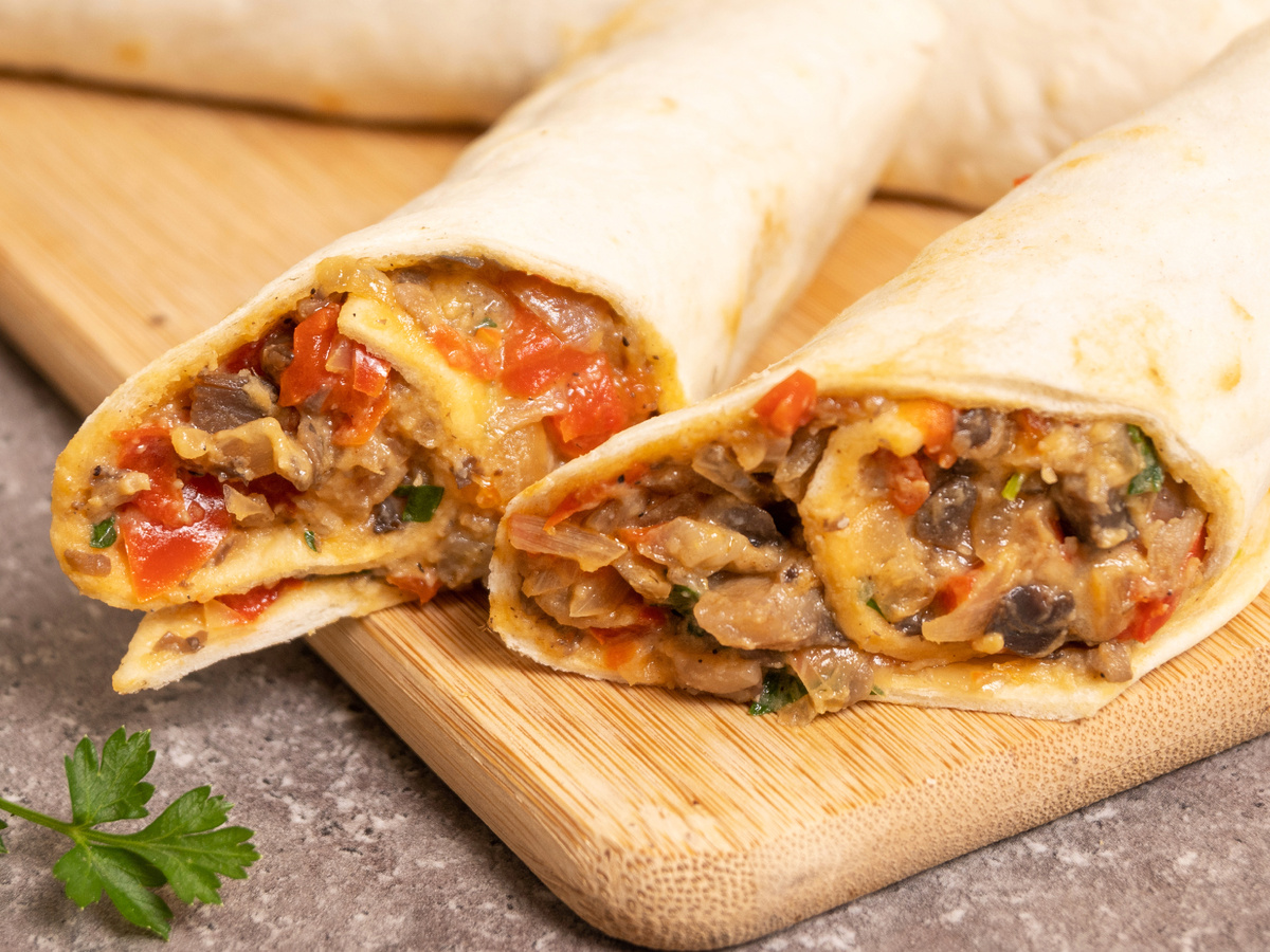 Как только начинка готова, добавьте свежую нарезанную петрушку и выключите огонь. Теплую лепешку следует заполнить начинкой, равномерно распределяя её, и аккуратно свернуть рулетиком, оставляя небольшое пространство по краям, чтобы начинка не вываливалась. Перед подачей рулеты следует нарезать наискосок, при желании полив чили соусом. Это блюдо отлично сочетается с разнообразными свежими овощами, создавая полноценный приём пищи.