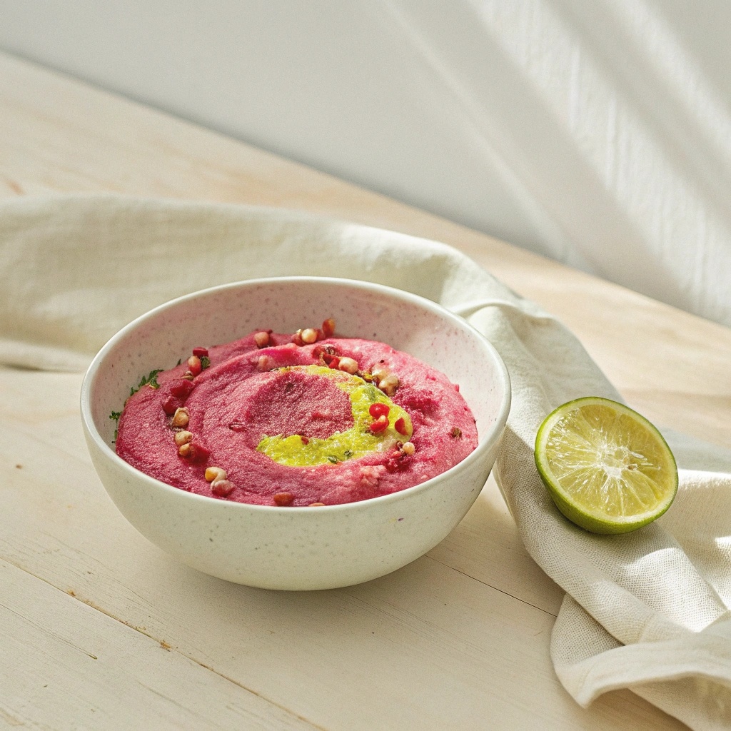 Приготовление: Свёклу запекать в фольге при температуре 180 °C в течение 45–50 минут до мягкости. После охлаждения очистите и нарежьте. В блендере соедините свёклу, нут, тахини, чеснок и сок лайма. Взбивайте до получения однородной массы, постепенно добавляя оливковое масло. Приправьте солью и перцем. Выложите хумус в миску, около него поместите йогурт и сбрызните маслом.