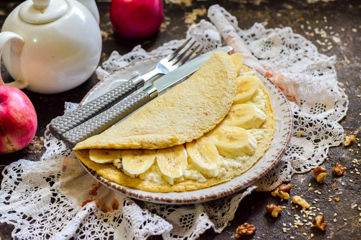 Приготовление: При помощи блендера измельчите овсянку, смешайте с яйцом и молоком. Обжаривайте на сухой сковороде по 2 минуты с каждой стороны. На готовый блин поместите начинку из размятого банана с творогом и корицей, сверните — и завтрак готов!