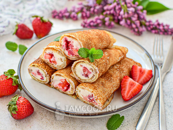 Теперь пришло время для начинки. Нужно соединить сыр маскарпоне с сахарной пудрой и хорошо перемешать. Готовые блинчики щедро смазываются кремом, сверху кладется нарезанная клубника, после чего блинчики аккуратно сворачиваются в трубочки.