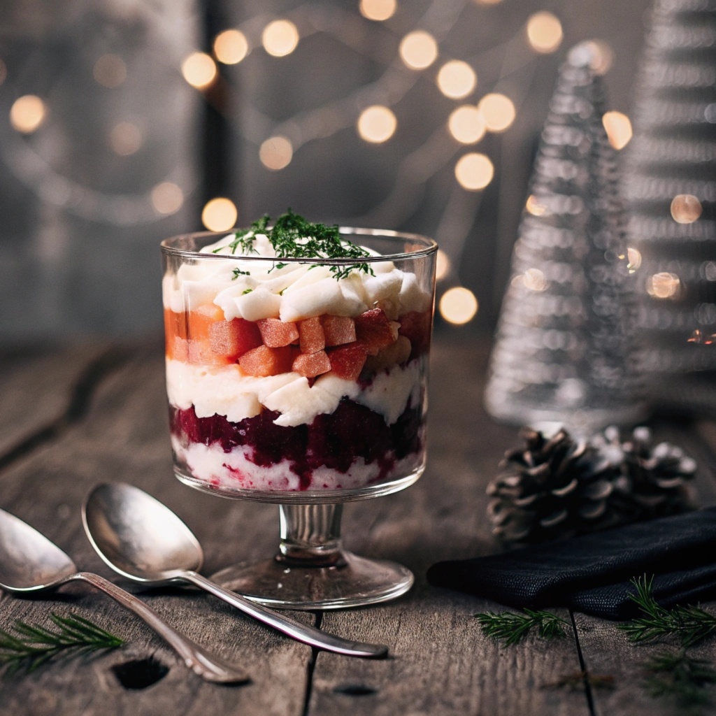 Можно заменить селедку на слабосоленую красную рыбу, а майонез — на сметану с горчицей.