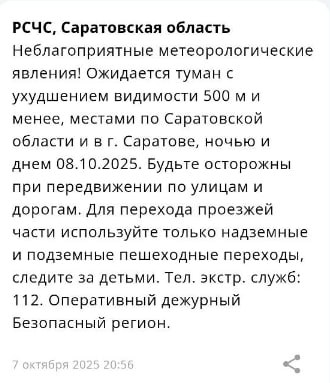 Экстренная информация РСЧС*: Ожидается туман с ухудшением видимости 500 м и менее, местами по Саратовской области и в Саратове ночью и днем 08.10.2025, — сказано в уведомлении.