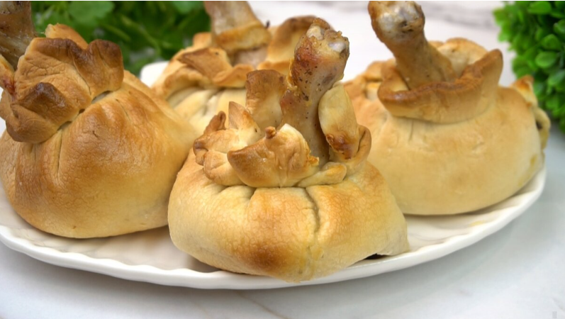 Теперь пришло время творить: раскатайте слоеное тесто и нарежьте его на части. На каждую из них положите ложку картофельного пюре, поставьте куриную ножку и сформируйте мешочек. Оберните его в фольгу, чтобы не подгорел, и поместите на противень, смазанный маслом.